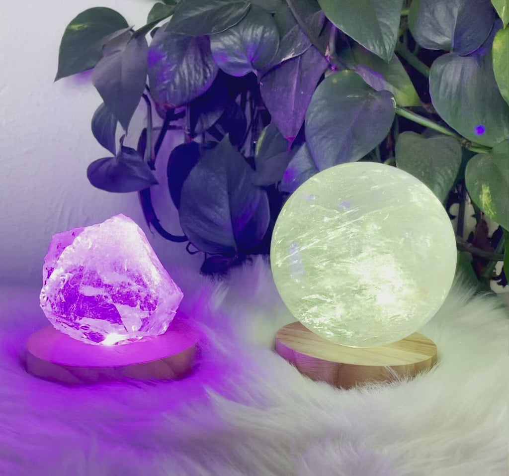 Esta base con luces LED es ideal para iluminar esferas, torres y otros especímenes, la luz cambia suavemente pasando por los colores del arcoíris. La terminación USB del cable permite conectarla a la luz con un cargador o batería externa.